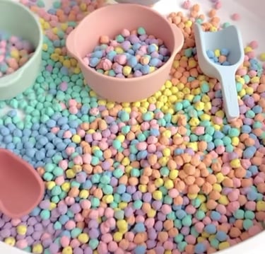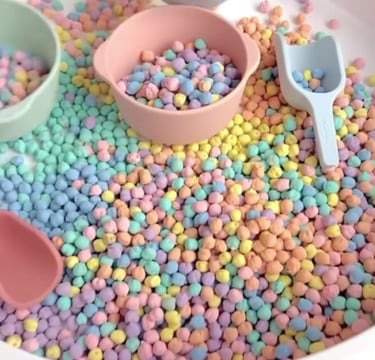 L'activité sensorielle avec des pois chiches colorés est une excellente manière d'éveiller les sens des enfants tout en stimulant leur créativité. En utilisant des pois chiches teints avec des couleurs naturelles, les enfants peuvent explorer ces petites billes sous différentes textures et nuances. Ils peuvent les manipuler, les trier par couleur, ou les utiliser pour créer des motifs sur une grande feuille de papier. Cette activité permet non seulement d'améliorer leur coordination main-œil, mais aussi de développer leur concentration et leur sens de l'organisation. Dès 18 mois*.