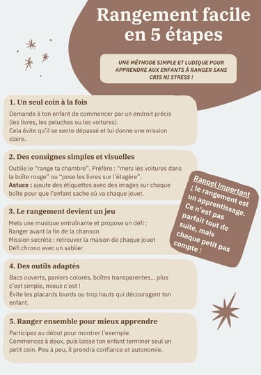 Et si vous voulez aller plus loin, téléchargez gratuitement ma fiche pratique “Rangement facile en 5 étapes” pour transformer la chambre de vos enfants… sans cris ni stress !